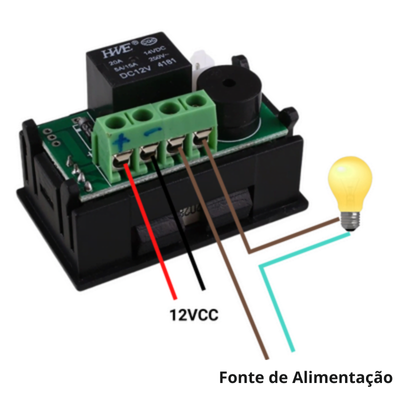 O Controlador de Temperatura W1209-WK trabalha com a tensão de alimentação de 12VCC, sendo necessário a utilização de uma fonte de alimentação que forneça no mínimo 1A de corrente para a correta funcionalidade do dispositivo. Para realizar a ligação dos fios, faça como descrito na imagem a seguir: