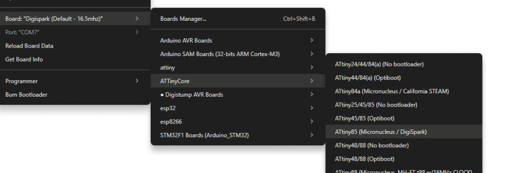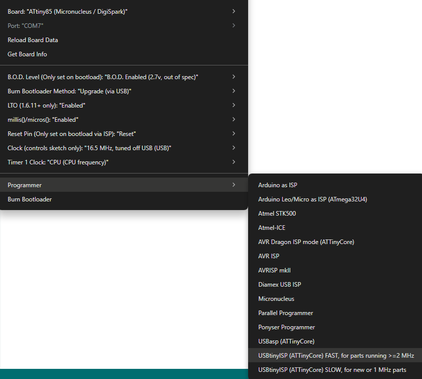 O ATTinyCore do Spence Konde é um pacote para Arduino IDE que facilita a configuração de fuses, gravação de bootloaders e programação de chips ATtiny, incluindo perfis prontos para o Micronucleus.