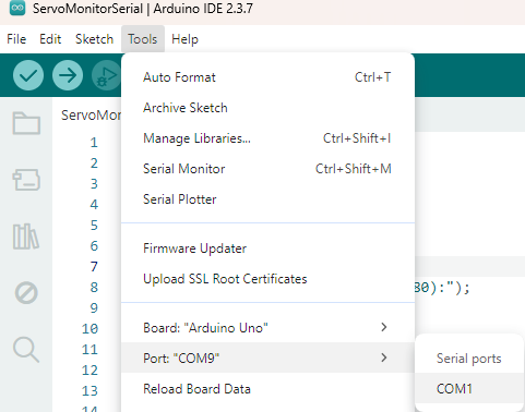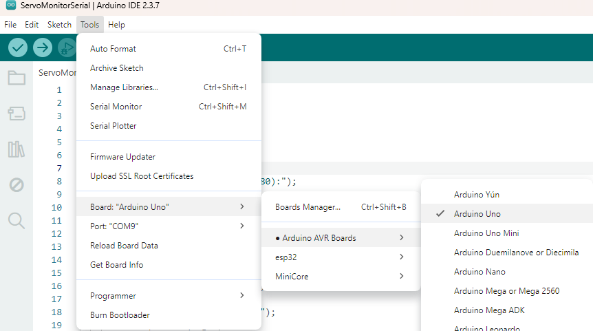 Os servos precisam ser previamente posicionados para que o controle e amplitude de movimento do braço possam ser feitos de forma correta. Para isso precisaremos conectar o servo ao Arduino e usar o Arduino IDE, caso não saiba como faze-lo clique aqui para ir até nosso post sobre os servos. Caso já tenha sua IDE instalada, siga os passos abaixo.