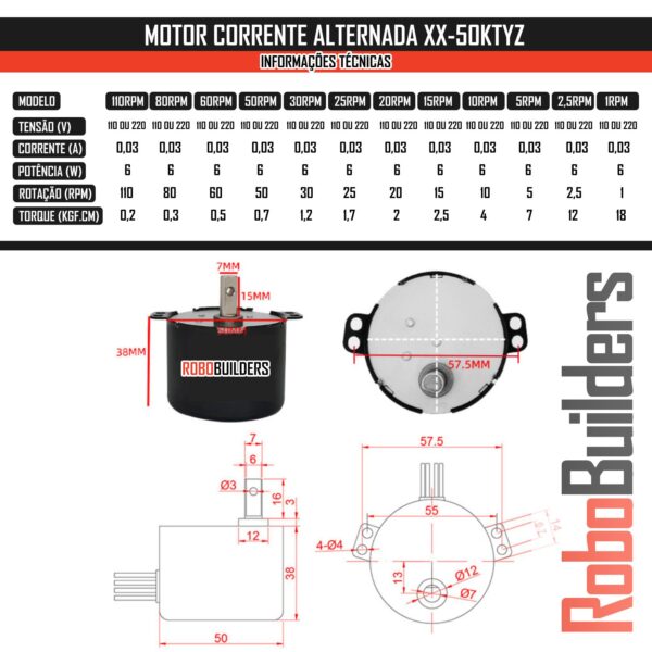 • Velocidade: Variantes comuns de 1RPM, 2,5 RPM, 5 RPM, 10RPM, 15 RPM, 20RPM,  30 RPM, 50 RPM, 80RPM;