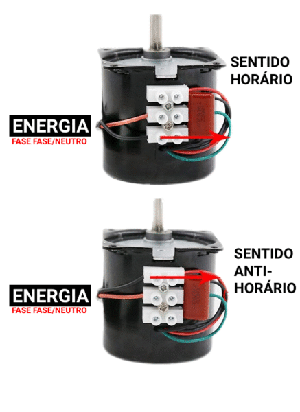 O motor pode ser conectado de forma simples e rápida, como mostrado abaixo. Se atente ao posicionamento dos fios para garantir o sentido correto de giro.